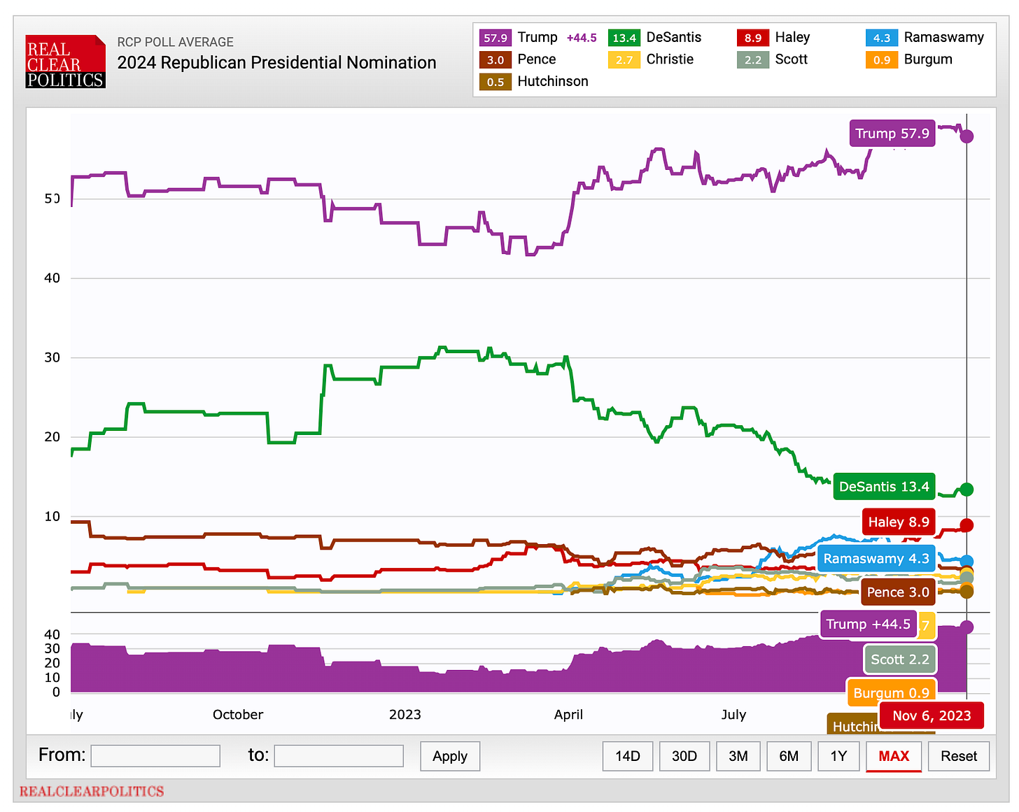 But is it plausible to assume every poll is bogus, or responsible to proceed under that assumption as if we have nothing to worry about? Because out of the almost 200 primary polls in RCP’s full list, DeSantis only led in one of them. Granted, the list is not exhaustive, but it speaks to the scale of what we would be alleging by giving this explanation too much weight. Remember that MAGA are the ones who cry FAKE! and RIGGED! at any whiff of bad news. We’re for DeSantis in part because we don’t like wrapping ourselves in denial when things don’t go our way.