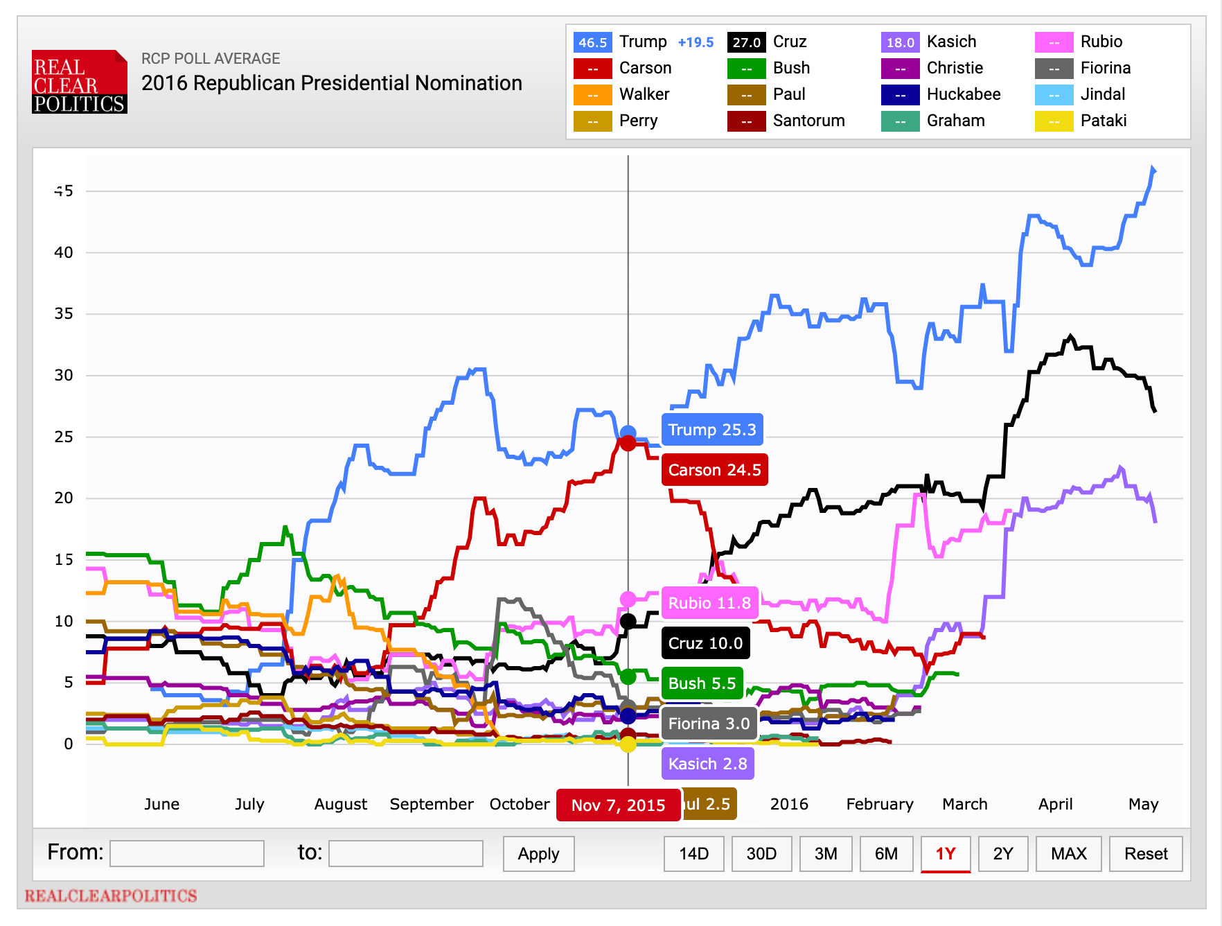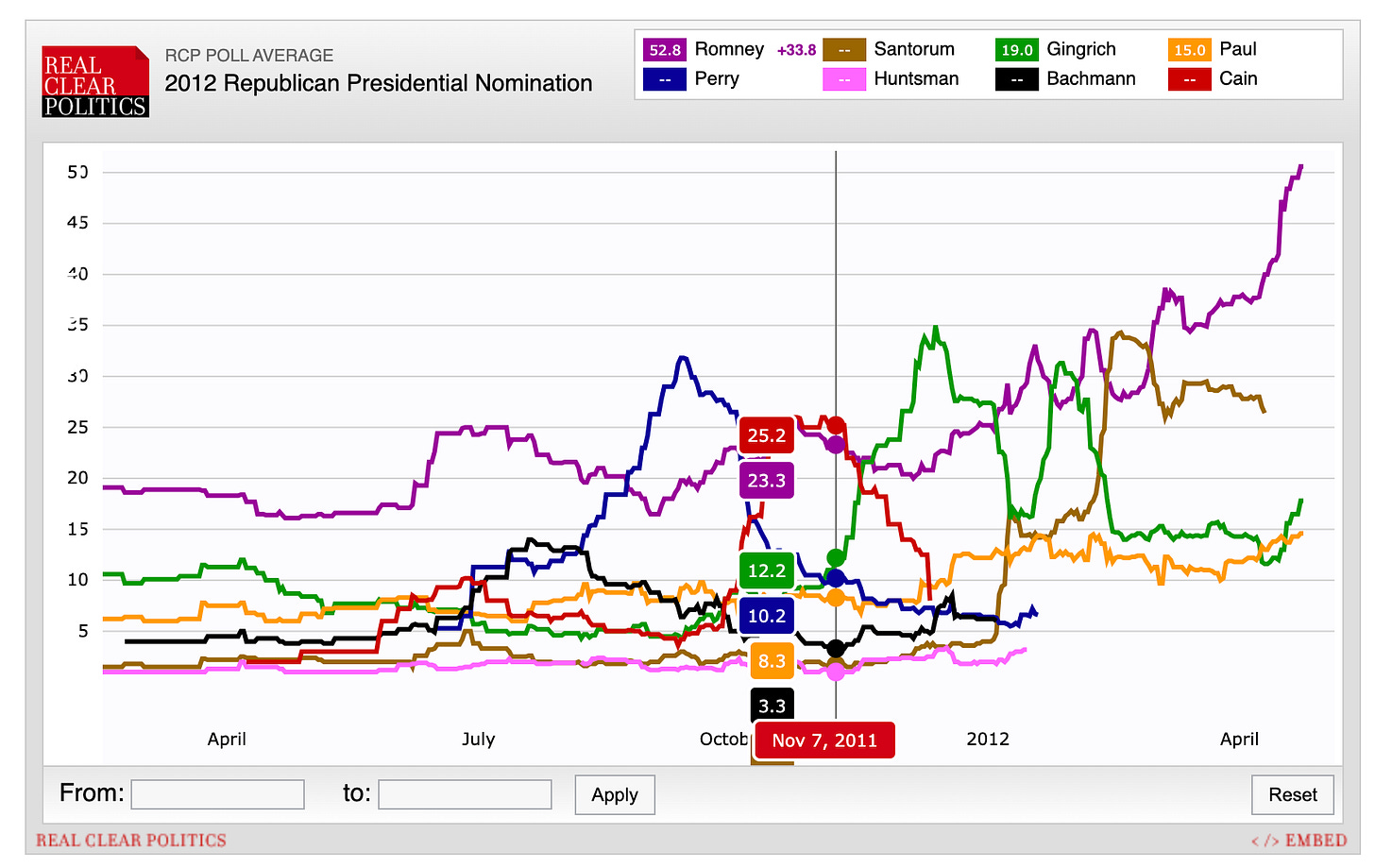 Lastly, it’s true that candidate support moves around a lot once the actual voting starts. But looking back at the 2012 and 2016 primaries, the eventual winners, while not uninterrupted frontrunners from the start, did have and maintain higher support than most of their competitors from well before November: